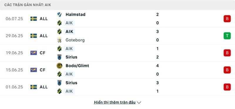 5 trận gần nhất của AIK: L-W-L-L-L