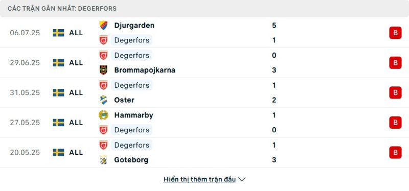 5 trận gần nhất của Degerfors IF: L-L-L-L-L