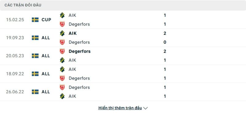 Thành tích đối đầu của AIK vs Degerfors IF