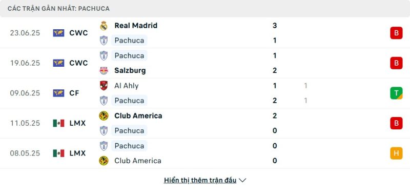 5 trận gần nhất của Pachuca: L-L-D-L-D