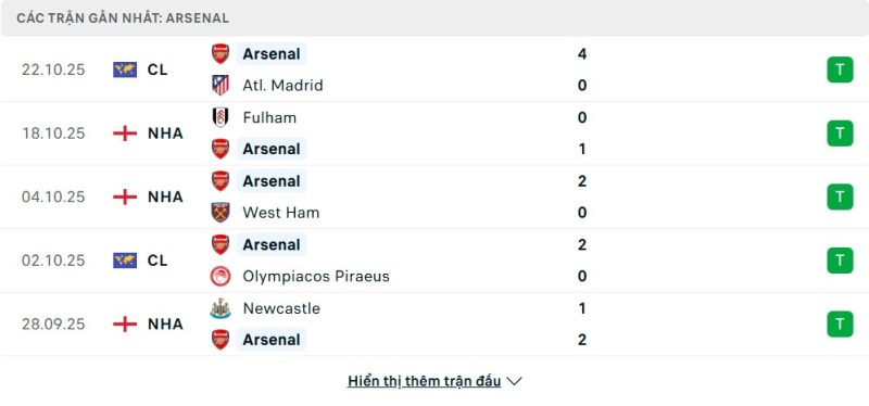 5 trận gần nhất của Arsenal: W-W-W-W-W