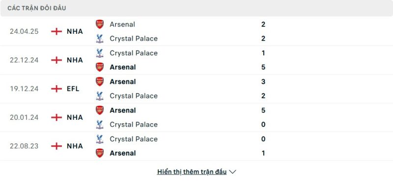 Thành tích đối đầu của Arsenal vs Crystal Palace