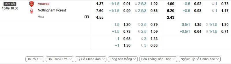 Bảng Tỷ lệ kèo bóng đá Arsenal vs Nottingham Forest