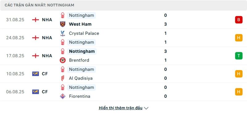 5 trận gần nhất của Nottingham Forest: L-D-W-D-D