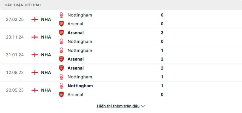 Thành tích đối đầu của Arsenal vs Nottingham Forest