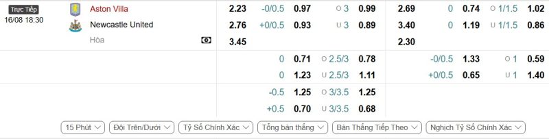 - Kèo tỷ số bóng đá hiệp 1: Aston Villa 2-0 Newcastle United