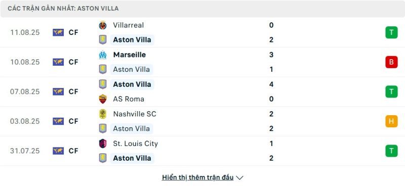 5 trận gần nhất của Aston Villa: W-L-W-D-W