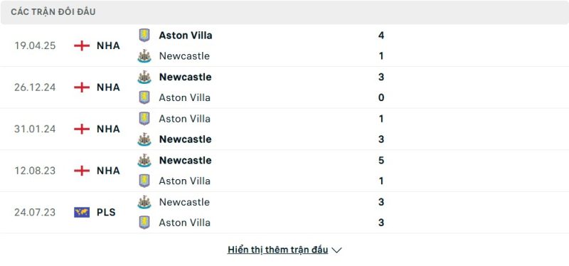 Thành tích đối đầu của Aston Villa vs Newcastle United