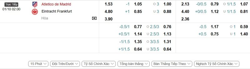 Bảng Tỷ lệ kèo bóng đá Atlético Madrid vs Eintracht Frankfurt