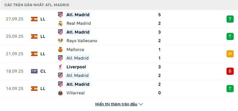 5 trận gần nhất của Atlético Madrid: W-W-D-L-W