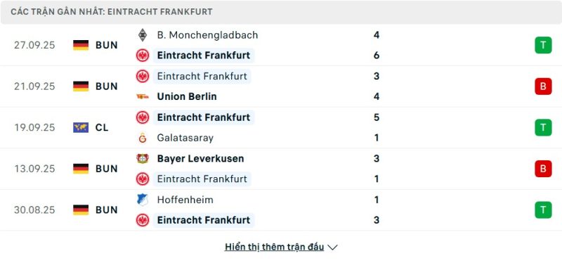5 trận gần nhất của Eintracht Frankfurt: W-L-W-L-W