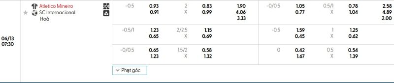 Bảng Tỷ lệ kèo bóng đá Atlético Mineiro vs Internacional