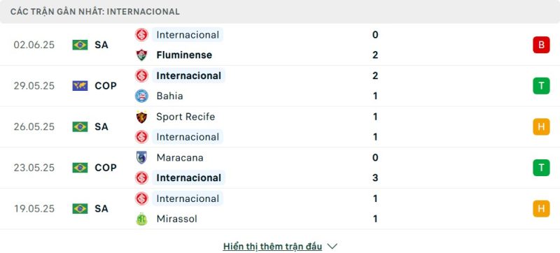 Bên kia chiến tuyến, Internacional đang trải qua chuỗi phong độ vô cùng bấp bênh khi không thắng trong 5 trận gần nhất, chỉ có 2 trận hòa và để thua tới 3 lần. Trong 3 trận gần đây nhất, họ cũng chỉ ghi được 2 bàn thắng và thủng lưới 2 lần. Đây là một thống kê phản ánh rõ sự thiếu ổn định, đặc biệt là trên mặt trận tấn công.