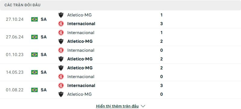 Thành tích đối đầu của Atlético Mineiro vs Internacional