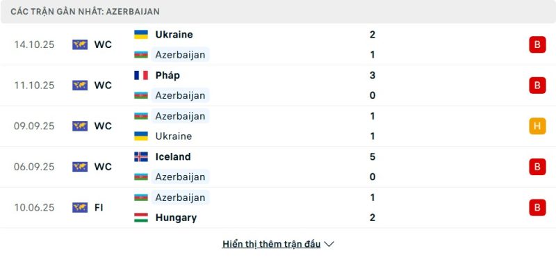 5 trận gần nhất của Azerbaijan: L-L-D-L-L