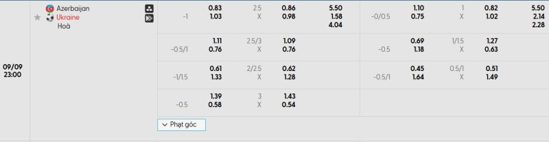 Bảng Tỷ lệ kèo bóng đá Azerbaijan vs Ukraina