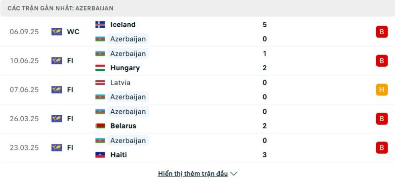 5 trận gần nhất của Azerbaijan: L-L-D-L-L