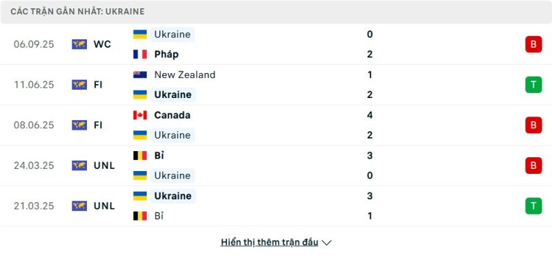 5 trận gần nhất của Ukraina: L-W-L-L-W