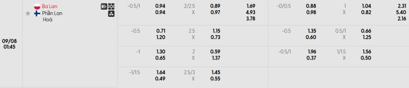 Bảng Tỷ lệ kèo bóng đá Ba Lan vs Phần Lan