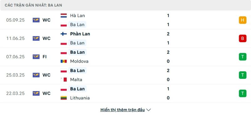 5 trận gần nhất của Ba Lan: D-L-W-W-W