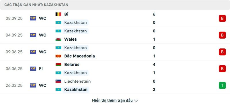 5 trận gần nhất của Kazakhstan: L-L-L-L-W