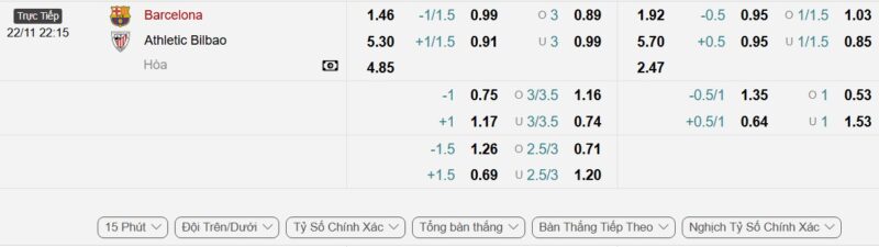 Bảng Tỷ lệ kèo bóng đá Barcelona vs Athletic Bilbao