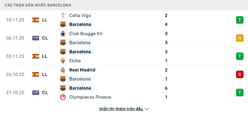 Thống kê phong độ gần đây Barcelona vs Athletic Bilbao