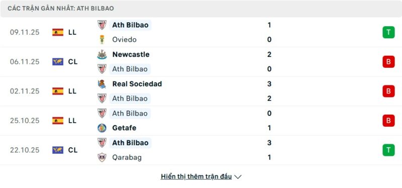 5 trận gần nhất của Athletic Bilbao: W-L-L-L-W