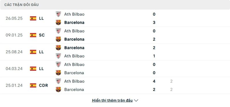 Thành tích đối đầu của Barcelona vs Athletic Bilbao