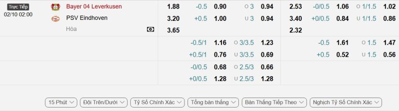 - Kèo tỷ số bóng đá hiệp 1: Bayer Leverkusen 1-0 PSV Eindhoven