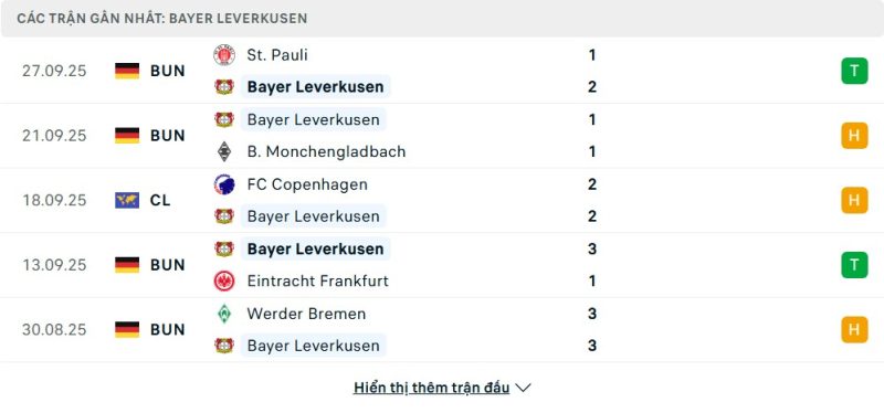 Bayer Leverkusen đang có sự khởi đầu mùa giải tương đối ổn định khi liên tiếp giành được những kết quả tích cực tại Bundesliga và đấu trường cúp. Họ từng thắng Frankfurt 3-1, vượt qua St. Pauli với tỷ số sít sao và cầm hòa M’gladbach trong trận cầu căng thẳng. Ở Champions League, đội bóng này cũng cho thấy bản lĩnh khi rời sân của København với một trận hòa đầy nỗ lực. Với sự hiện diện trong nhóm giữa bảng xếp hạng Champions League sau lượt đầu, Leverkusen khẳng định họ vẫn giữ vững tinh thần chiến đấu và sẵn sàng cho thử thách lớn trước mắt.