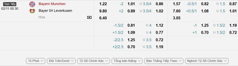 - Kèo tỷ số bóng đá hiệp 1: Bayern Munich 2-1 Bayer Leverkusen