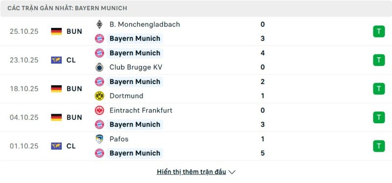 5 trận gần nhất của Bayern Munich: W-W-W-W-W