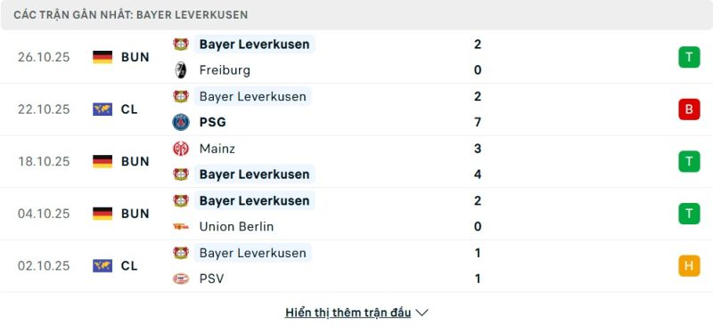 Bayer Leverkusen cũng có khởi đầu mạnh mẽ không kém, hiện đứng thứ 5 trên bảng xếp hạng. Họ có được 5 chiến thắng, 2 trận hòa và chỉ chịu 1 thất bại sau 8 vòng đấu. Phong độ gần đây của đội bóng này rất ổn định, đặc biệt với chiến thắng quan trọng trước PSG tại Champions League. Lối chơi tấn công hiệu quả giúp họ ghi 18 bàn tại Bundesliga, trong khi hàng thủ hoạt động khá chắc chắn. Đây chắc chắn là thử thách lớn cho Bayern.