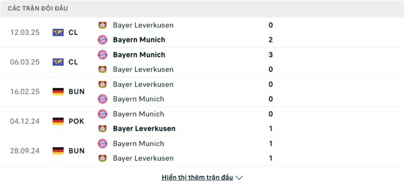 Thành tích đối đầu của Bayern Munich vs Bayer Leverkusen
