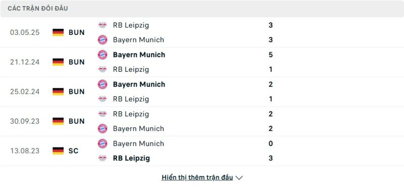 Thành tích đối đầu của Bayern Munich vs RB Leipzig