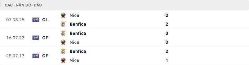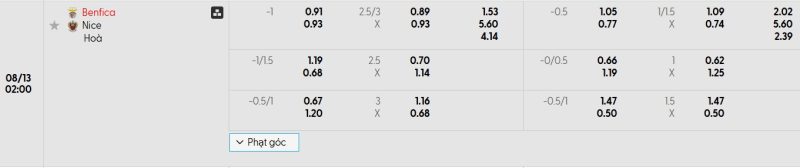 Bảng Tỷ lệ kèo bóng đá Benfica vs Nice