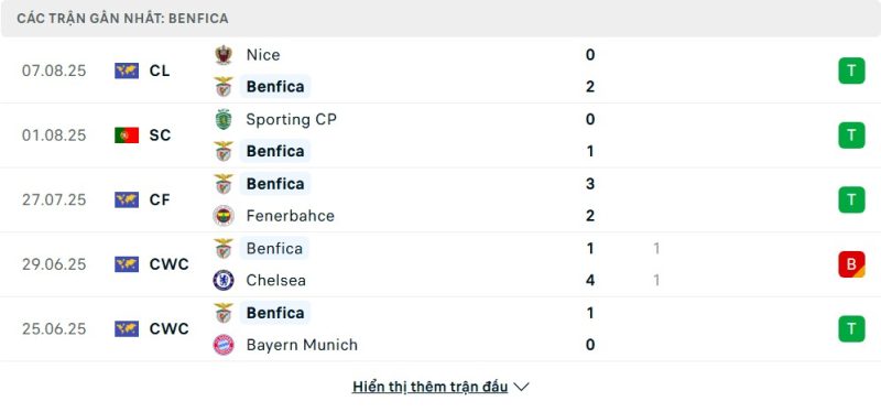 5 trận gần nhất của Benfica: W-W-W-D-W