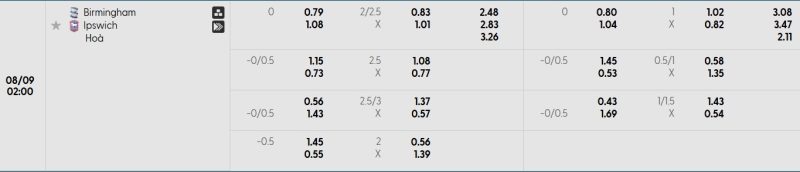 Bảng Tỷ lệ kèo bóng đá Birmingham City vs Ipswich Town