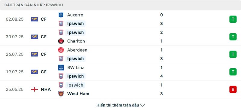 Bên kia chiến tuyến, Ipswich Town mùa trước thi đấu ở Premier League nhưng không thể trụ hạng, phải trở lại Championship. Trong loạt trận giao hữu hè, họ cho thấy sự chuẩn bị nghiêm túc và hiệu quả, thắng Auxerre 3-0, BW Linz 4-1 và Aberdeen 3-1. Dù vậy, vẫn tồn tại những trận thua đáng chú ý như thất bại 1-3 trước West Ham hay 0-2 trước Leicester. Lối chơi của Ipswich đang được cải thiện rõ rệt, với hàng công sắc bén và hàng thủ thi đấu kỷ luật hơn so với giai đoạn cuối mùa trước.