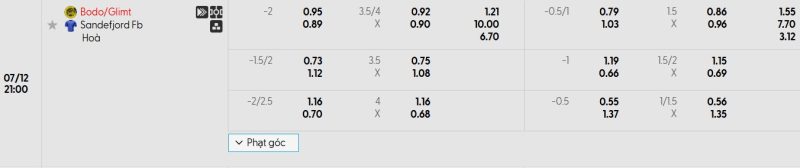 Bảng Tỷ lệ kèo bóng đá Bodø/Glimt vs Sandefjord