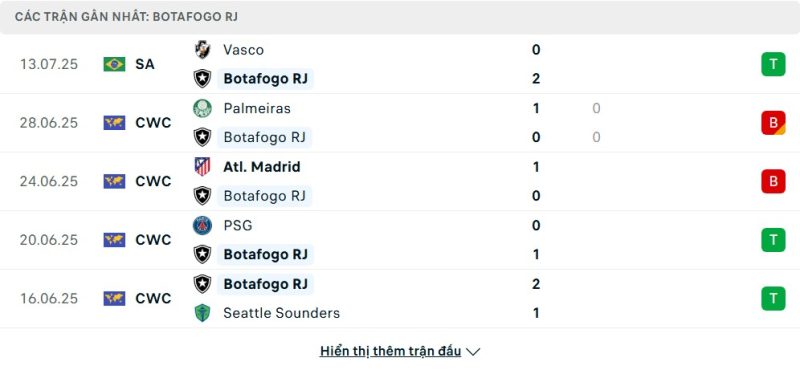 5 trận gần nhất của Botafogo: W-D-L-W-W
