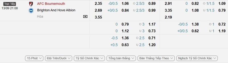 Bảng Tỷ lệ kèo bóng đá Bournemouth vs Brighton & Hove Albion