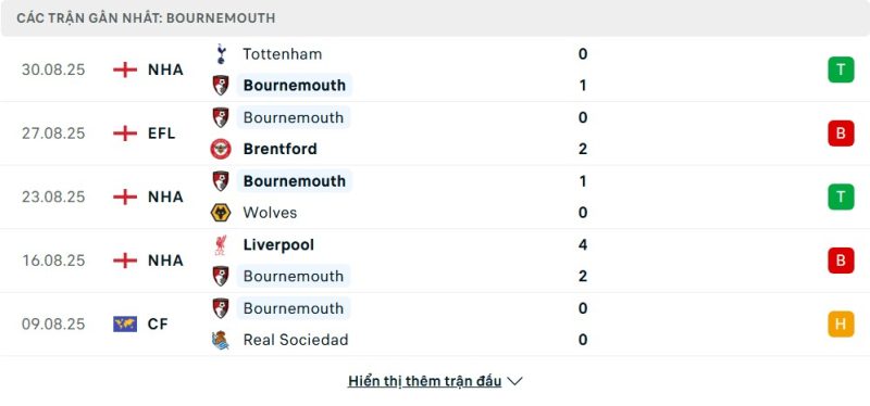 5 trận gần nhất của Bournemouth: W-L-W-L-D