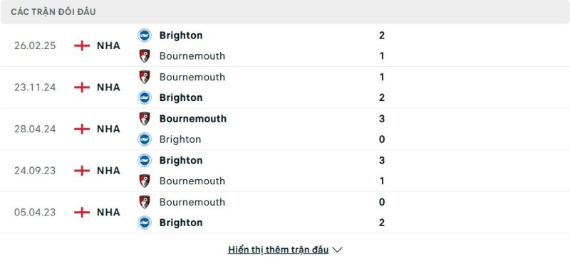Thành tích đối đầu của Bournemouth vs Brighton & Hove Albion