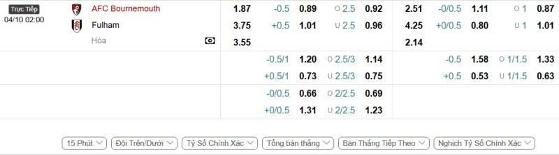 Bảng Tỷ lệ kèo bóng đá Bournemouth vs Fulham