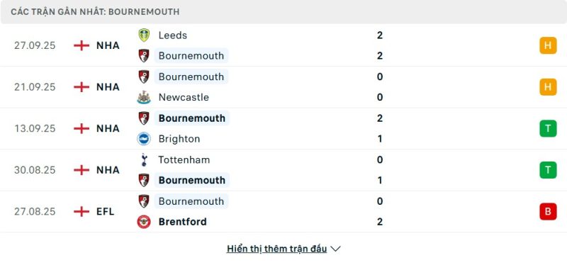 5 trận gần nhất của Bournemouth: D-D-W-W-L