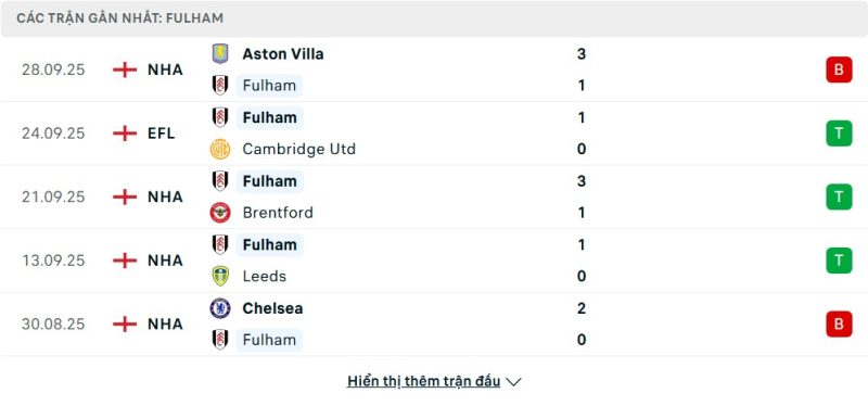 5 trận gần nhất của Fulham: L-W-W-W-L