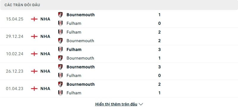 Thành tích đối đầu của Bournemouth vs Fulham