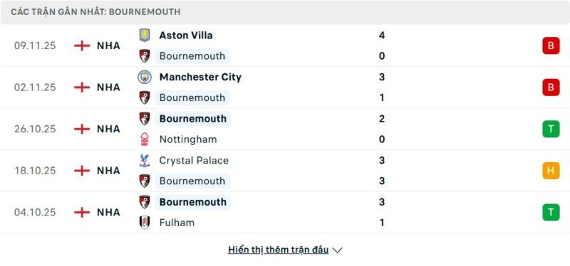 Thống kê phong độ gần đây Bournemouth vs West Ham United